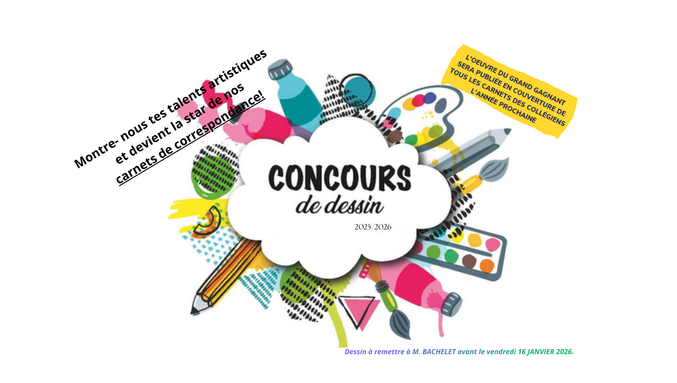 Par Alexandre Bachelet, publié le vendredi 21 novembre 2025 11:40 - Mis à jour le vendredi 21 novembre 2025 11:41Dessine la couverture du carnet de correspondance de l'an prochain /// dessin symbolisant pour toi le collège /// vote final par le CVC du collège /// à me rendre avant le 16 janvier 2026 -