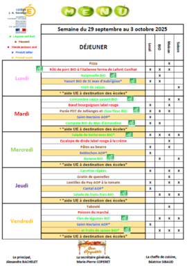 MENU DU 29 AU 3 OCTOBRE 2025